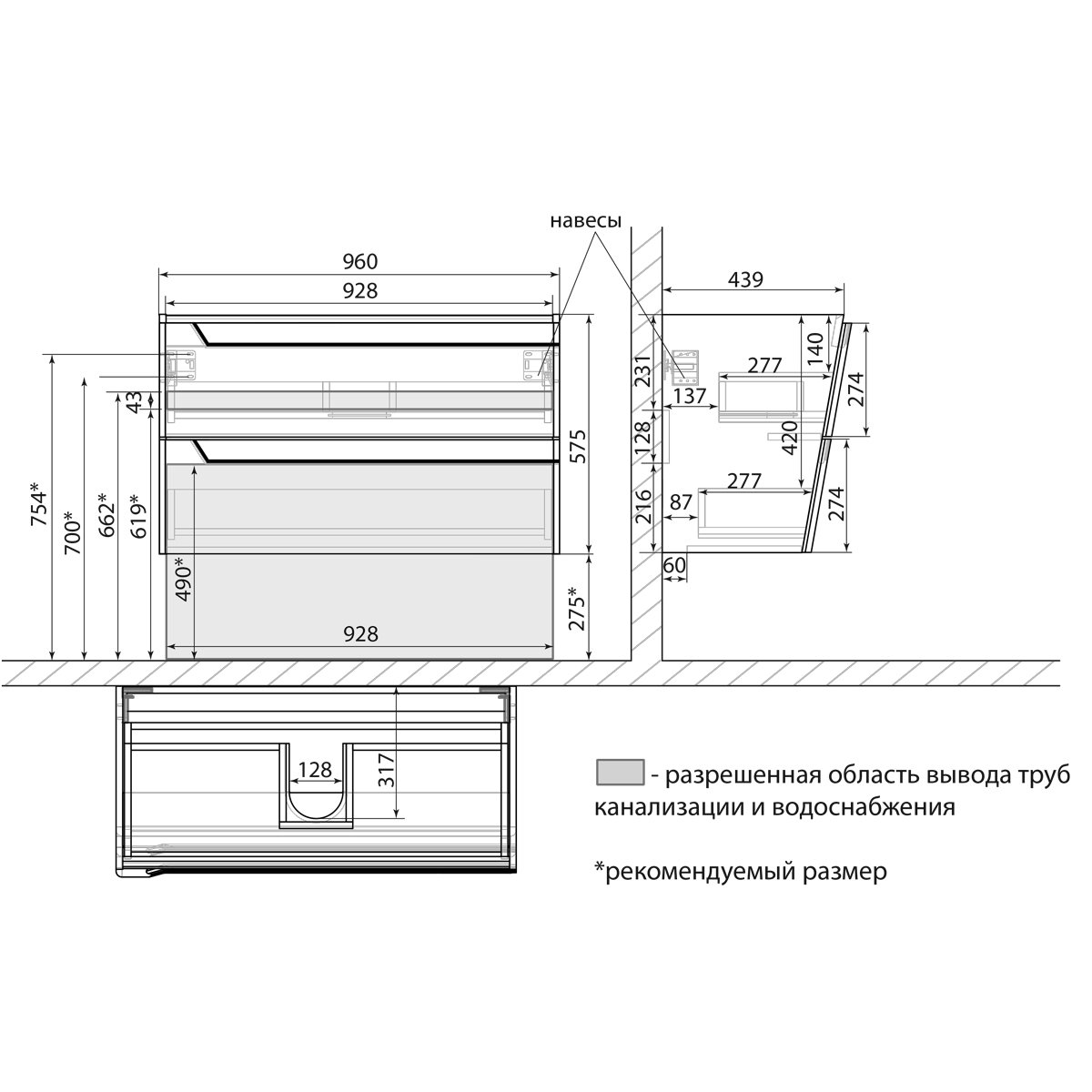 •Габариты без раковины (ШГВ): 960х439х575 мм;