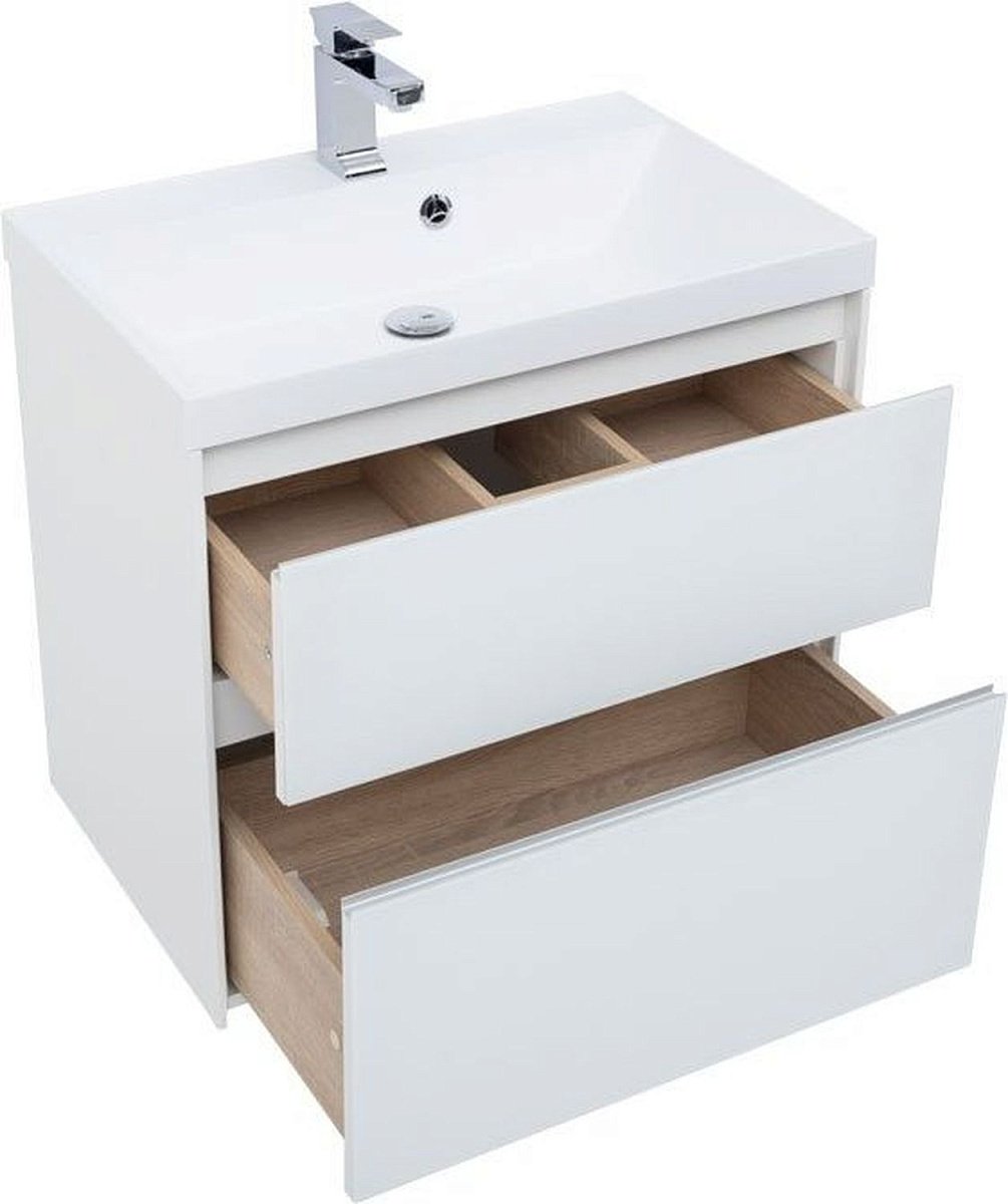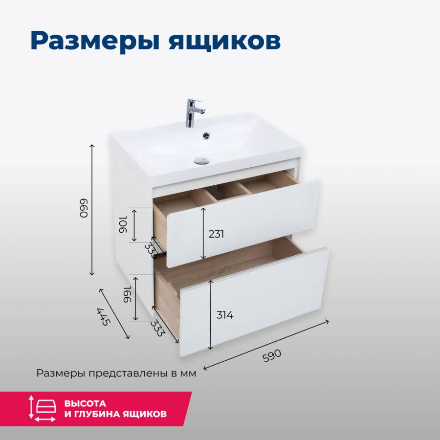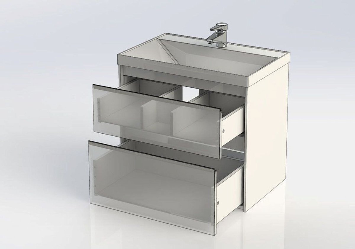 Производители позаботились о деталях. Ящики лишены выступающих деталей, ручки интегрированы в фасад. Тумбу шириной 60 см можно из подвесного элемента преобразовать в напольный, просто докупив универсальные ножки. Ящики тумб оснащены направляющими Hettich Quadro c плавным закрыванием, более известным нам как доводчик. Комплект тумбе составит раковина из литьевого мрамора «Орлеан», относящаяся к числу накладных моделей, которая внешне выглядит как единое целое с тумбой.