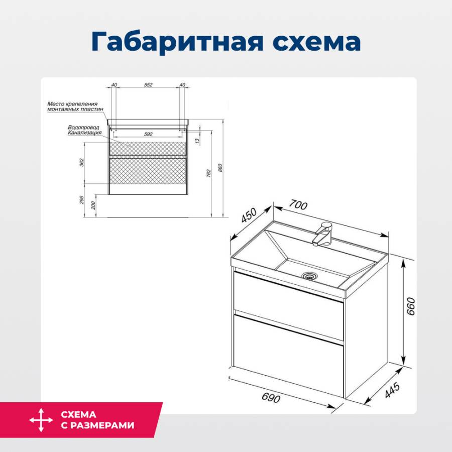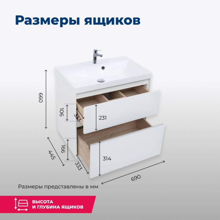 Производители позаботились о деталях. Ящики лишены выступающих деталей, ручки интегрированы в фасад. Тумбу шириной 70 см можно из подвесного элемента преобразовать в напольный, просто докупив универсальные ножки. Ящики тумб оснащены направляющими Hettich Quadro c плавным закрыванием, более известным нам как доводчик. Комплект тумбе составит раковина из литьевого мрамора «Орлеан», относящаяся к числу накладных моделей, которая внешне выглядит как единое целое с тумбой.