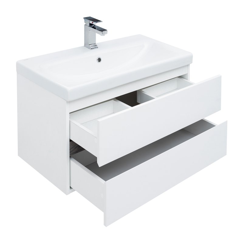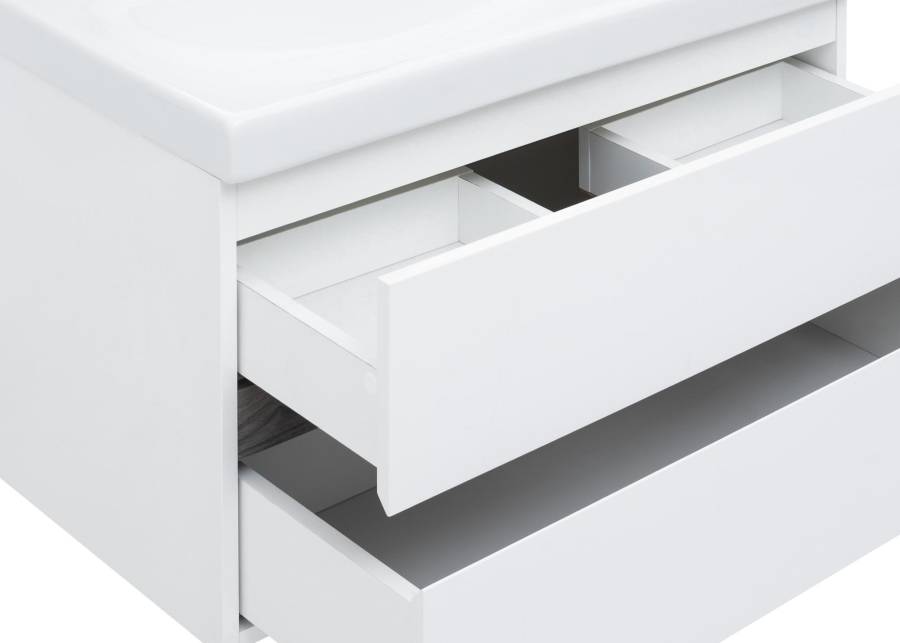 И еще одно важное преимущество: функциональная зона хранения в тумбе шириной 80 см. Она распределена между двумя выдвижными ящиками. Их внутренняя часть выполнена в белом цвете. Верхний ящик – это органайзер, разделенный на три отделения, где удобно хранить мелочи. Нижний более глубокий и позволит сложить полотенца или поставить весь арсенал пеномоющих или гигиенических средств. Ящики оборудованы доводчиками производства германской компании Hettich.