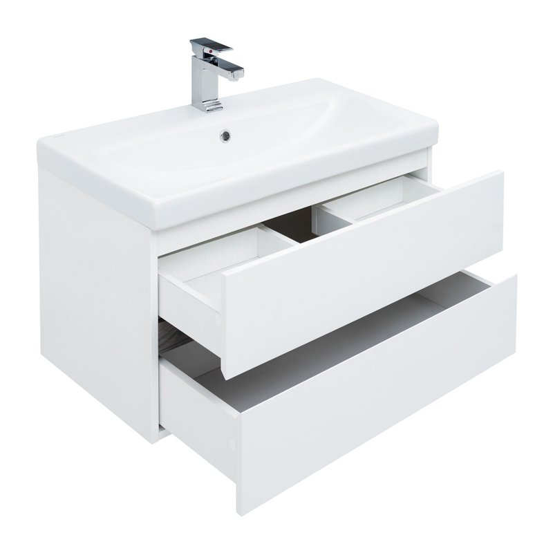 И еще одно важное преимущество: функциональная зона хранения в тумбе шириной 80 см. Она распределена между двумя выдвижными ящиками. Их внутренняя часть выполнена в белом цвете. Верхний ящик – это органайзер, разделенный на три отделения, где удобно хранить мелочи. Нижний более глубокий и позволит сложить полотенца или поставить весь арсенал пеномоющих или гигиенических средств. Ящики оборудованы доводчиками производства германской компании Hettich;