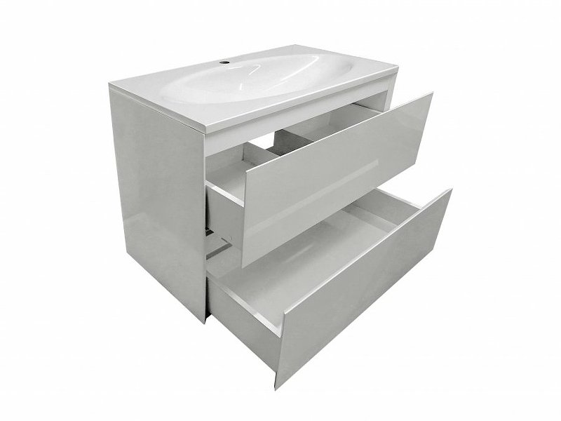 Подвесная тумба укомплектована прямоугольной раковиной из литьевого мрамора, плавно перетекающая в овальную чашу, которая добавляет изящность мебели и передает атмосферу стиля. В тумбе расположены 2 вместительных ящика, интегрированные ручки выполнены за счет скошенных фасадов. Мебель выполнена из влагостойкого ЛДСП и качественного MDF с использованием эмали RENNER (Италия). Ящики снабжены системой плавного закрывания. Для мебели используется фурнитура BLUM (Австрия).