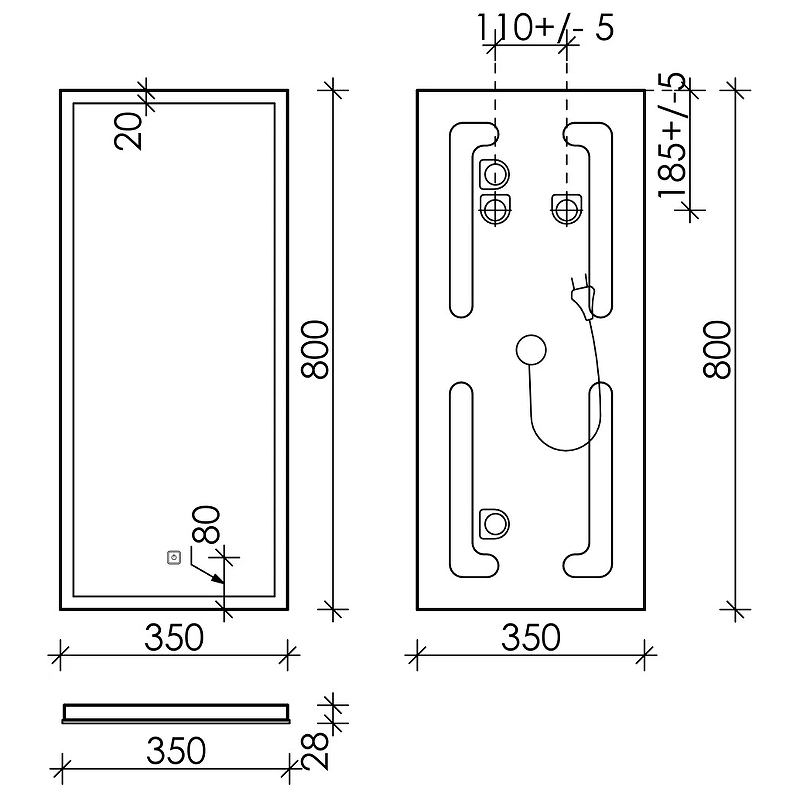 LED подсветка 4000К, сенсорный выключатель внизу на зеркал , пластиковый светопропускающий короб |
