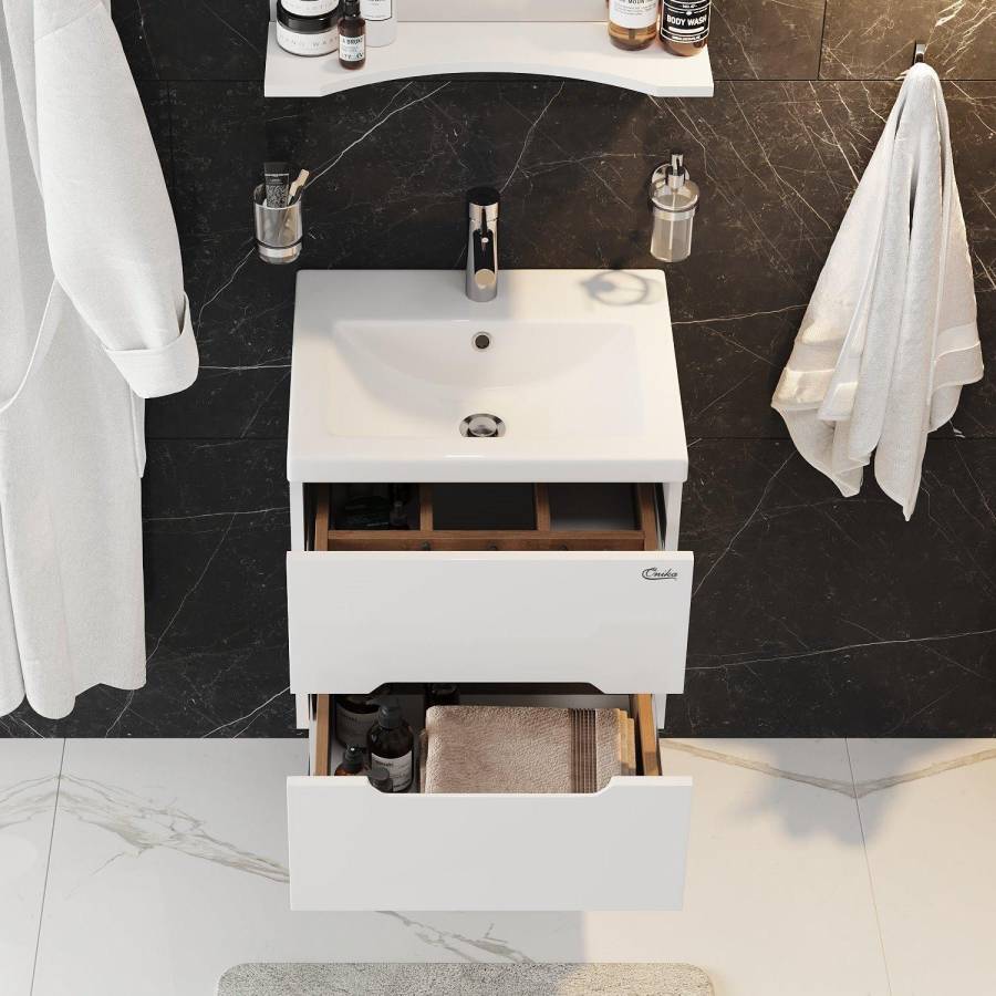 Тумба имеет два ящика с направляющими полного выдвижения: нижний предназначен для больших предметов, а верхний, имеющий удобную систему организации пространства, - для мелких аксессуаров. Ручки, изящно интегрированные в фасады, позволяют сделать эксплуатацию мебели более удобной и практичной.
