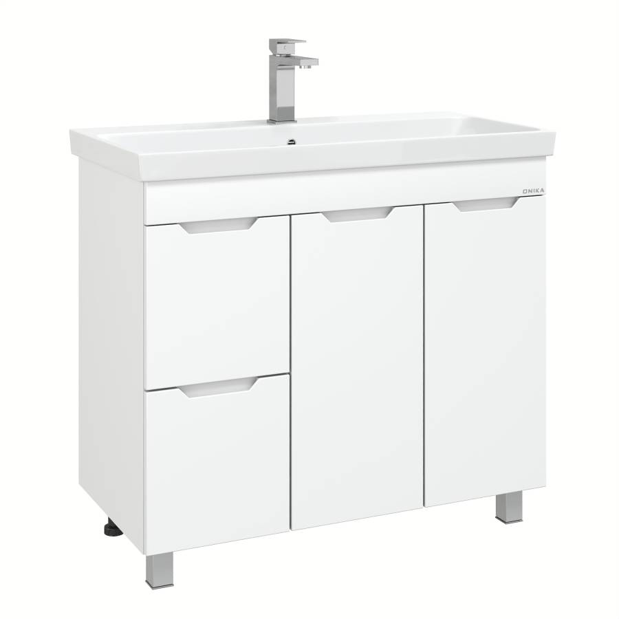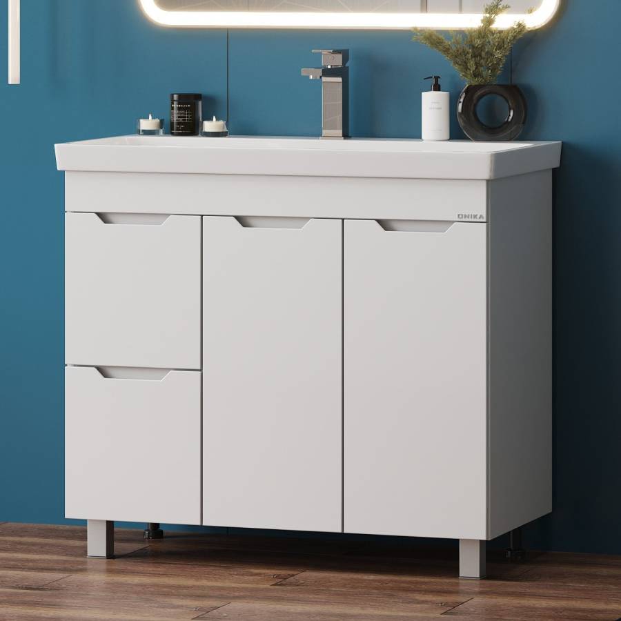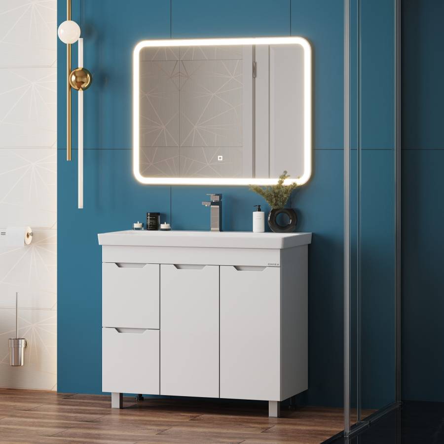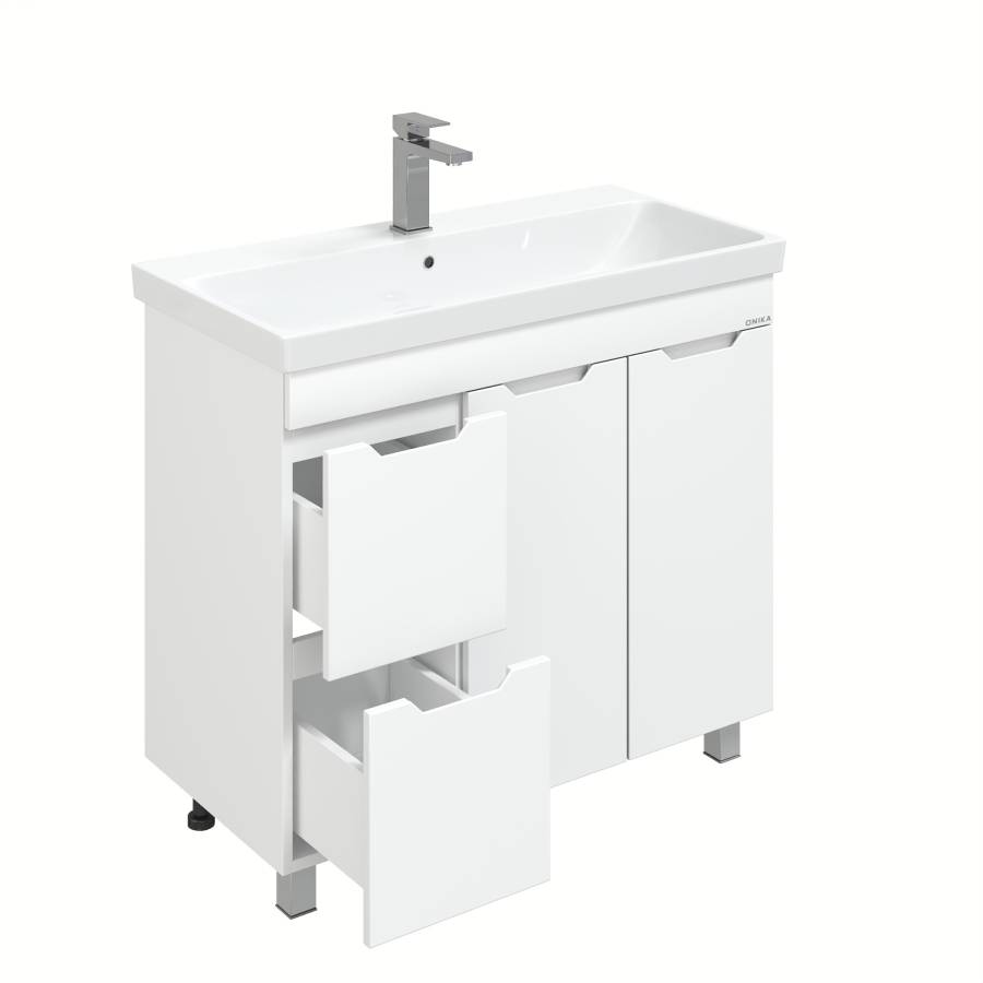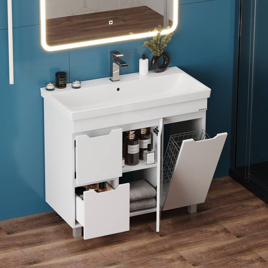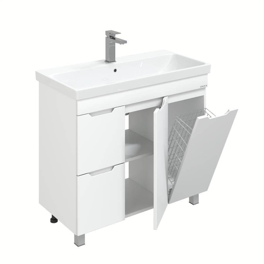 Тумба имеет два ящика с направляющими полного выдвижения, пространство за распашной дверцей с доводчиком и корзину для белья. Ручки, изящно интегрированные в фасады, позволяют сделать эксплуатацию мебели более удобной и практичной.