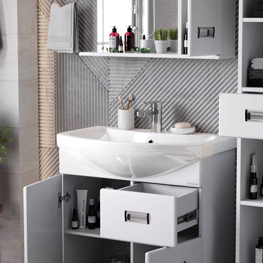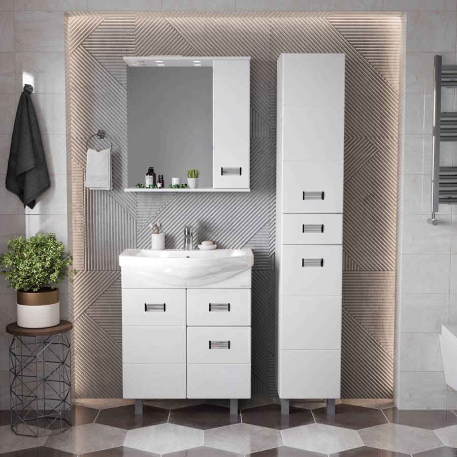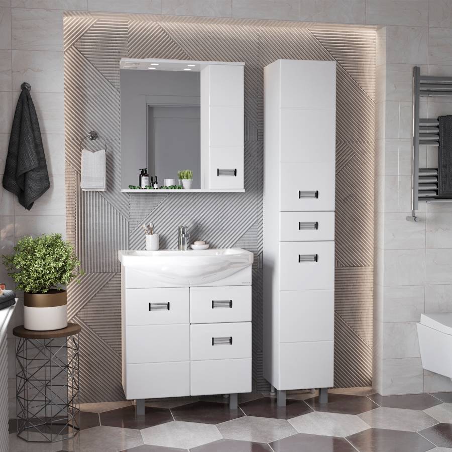 Глянцевый белый цвет фасада, ненавязчивая горизонтальная фрезеровка, врезные хромированные ручки и аккуратная лаконичность - все это позволяет коллекции Балтика стать центральным звеном интерьера ванной комнаты.