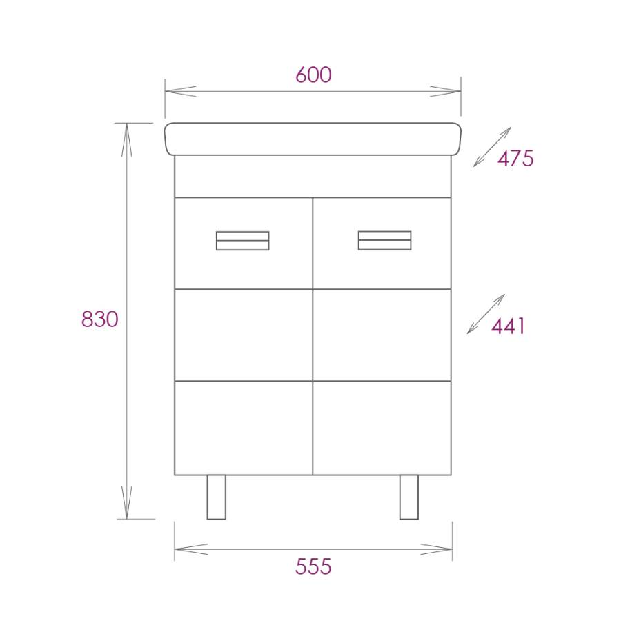 Размеры тумбы без учета раковины и ножек: 55x44x67 см.