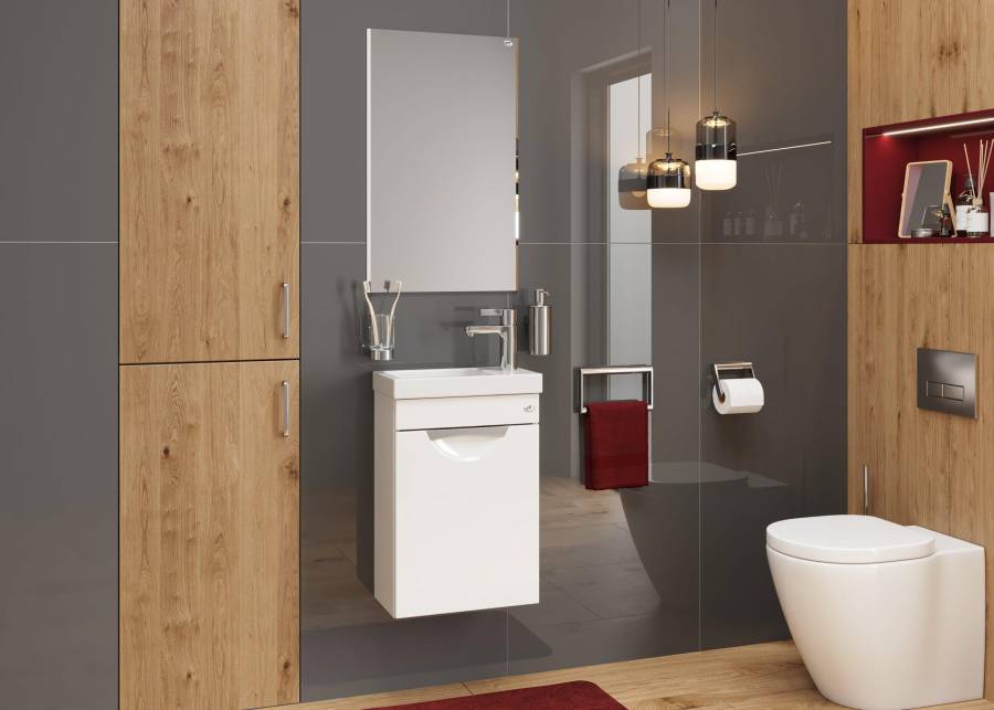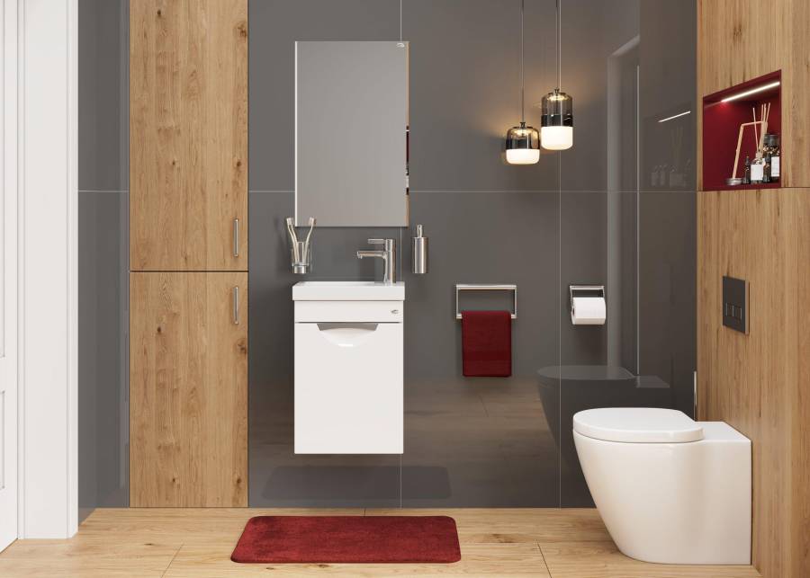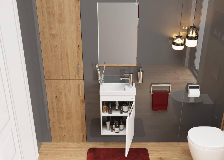 Тумба надежно крепится к стене и не занимает место на полу, не создавая при этом сложностей в уборке помещения.