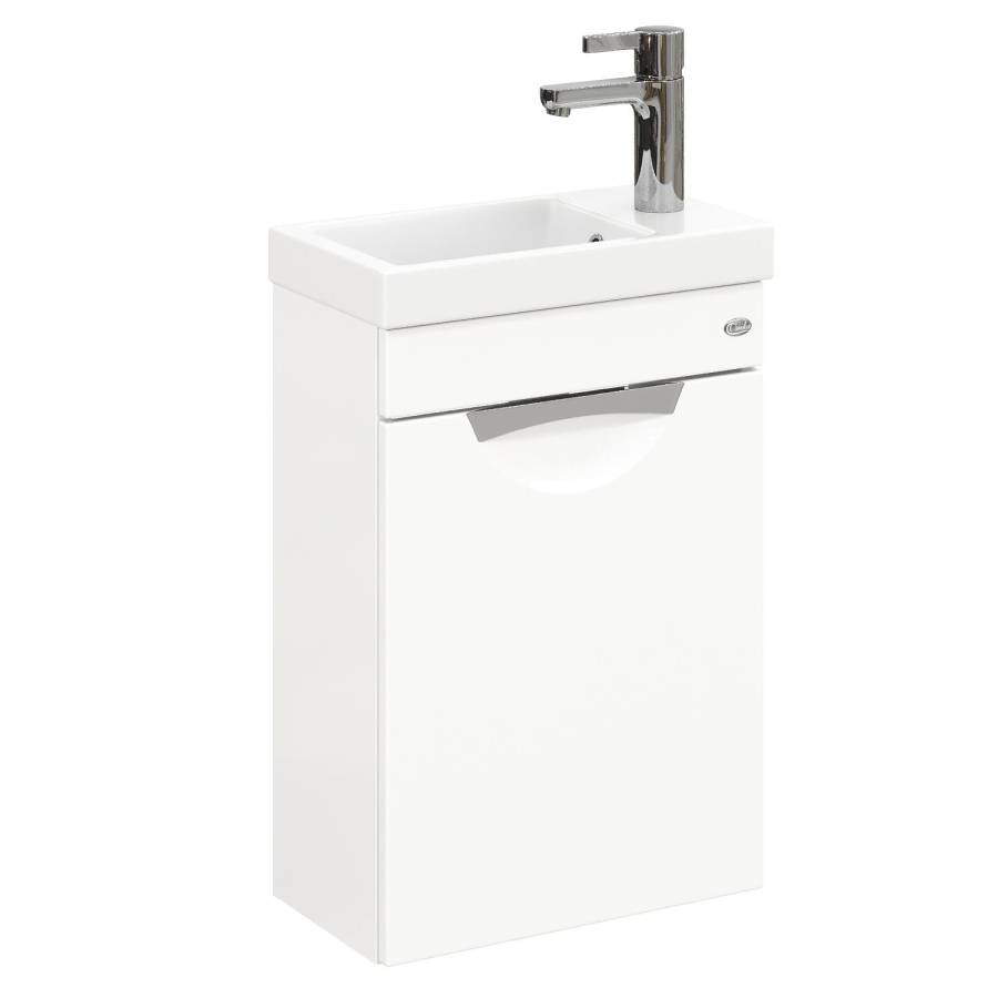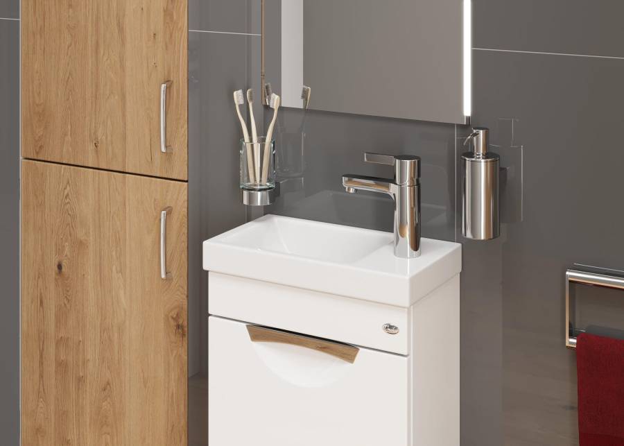 Главные особенности - это белая глянцевая поверхность, миниатюрные габариты, удобная врезная хромированная ручка на дверце с системой плавного закрывания, за которой есть место для размещения необходимых мелочей.