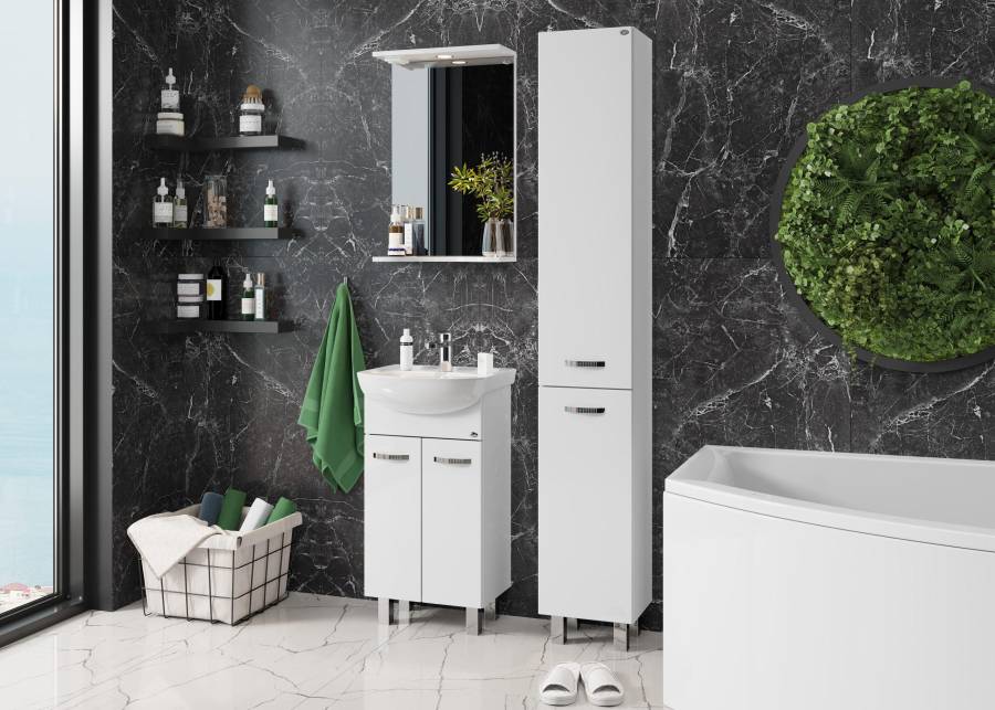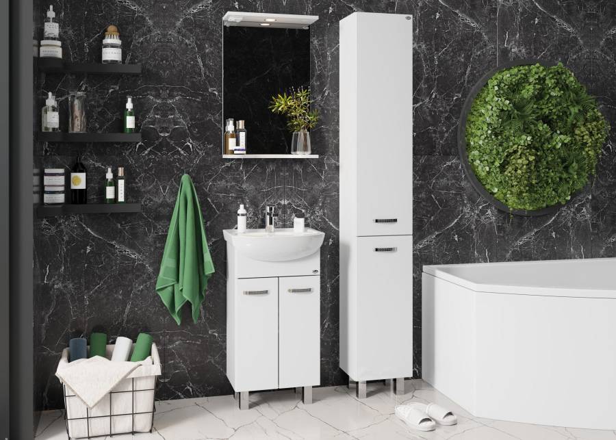 Строгие формы без декора и стильные хромированные ручки на двух распашных дверях, скрывают просторное внутреннее пространство с полкой для размещения необходимых бытовых принадлежностей.