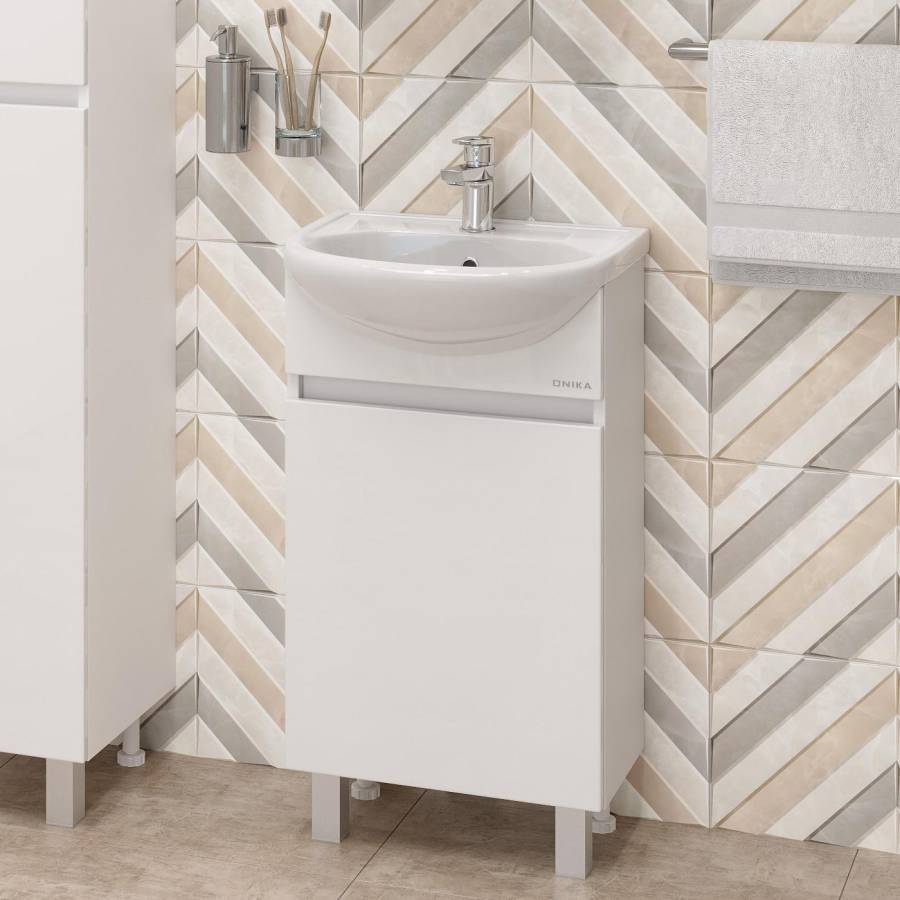 Тумба имеет белый глянцевый фасад и строгие формы без декора. За дверцей с интегрированной ручкой скрывается пространство с полкой для размещения необходимых бытовых принадлежностей.