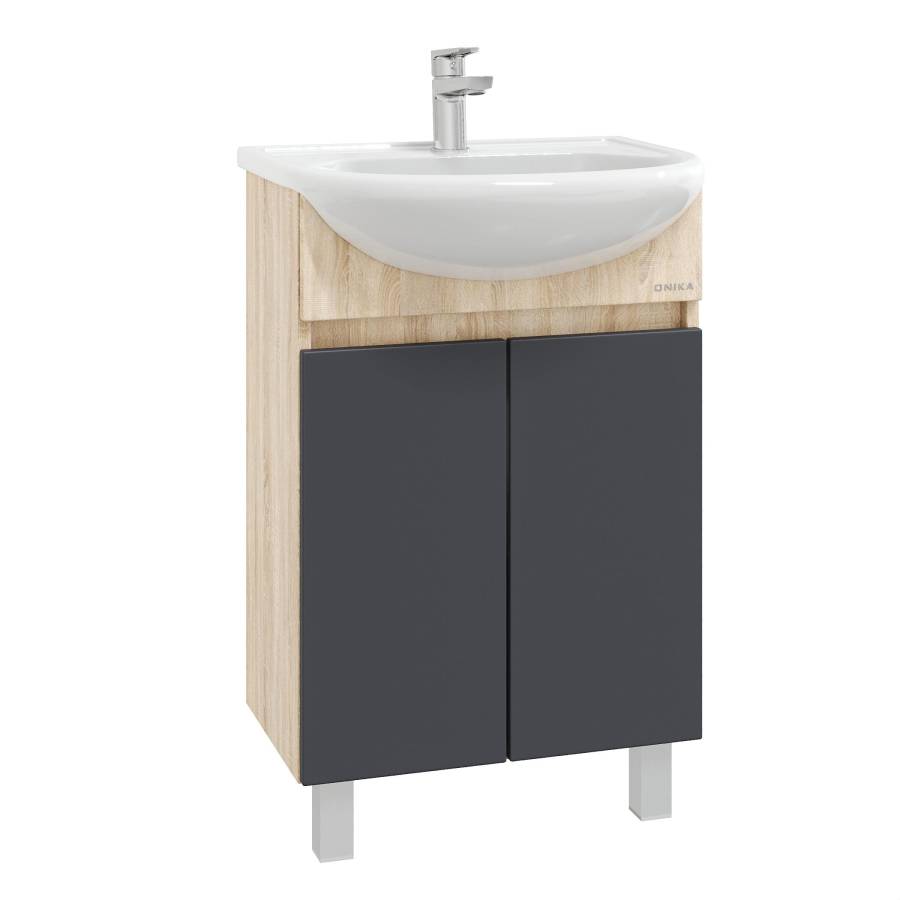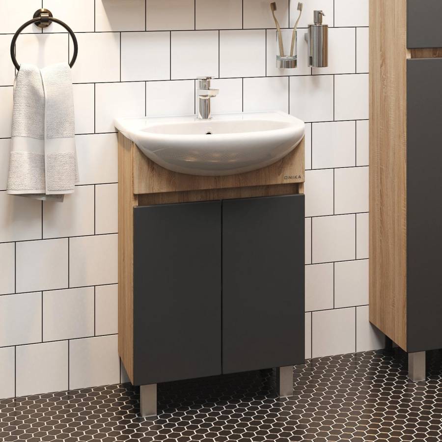 Тумба сочетает в себе красоту и функциональность: серый матовый фасад с покрытием SoftTouch, корпус цвета дуб сонома с роскошной текстурой, строгие формы без декора. За дверцей с интегрированной ручкой скрывается пространство с полкой для размещения необходимых бытовых принадлежностей.