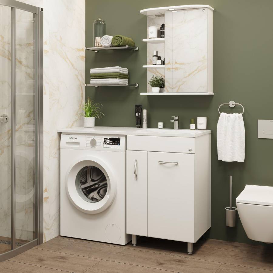 Пространство внутри тумбы очень функционально: слева высокий выдвижной ящик с двумя узкими отделениями для размещения бутылок бытовой химии, а справа - классическая распашная дверь скрывает нишу, разделенную горизонтальной полочкой, в которой будет удобно хранить банные принадлежности.