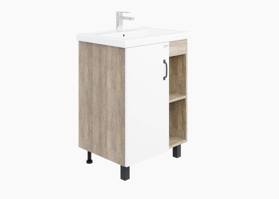 Открытые полки справа обеспечивают быстрый доступ к часто используемым аксессуарам, а пространство за распашной дверцей слева, снабженной системой плавного закрывания, станет удобным местом для хранения различных бытовых принадлежностей.
