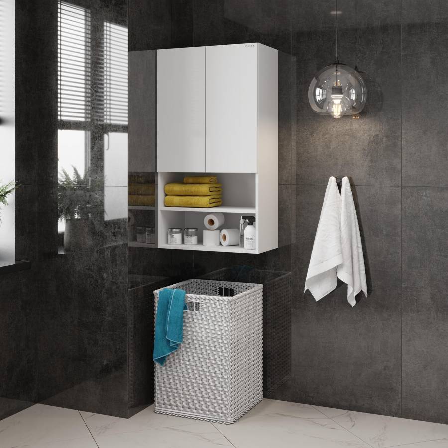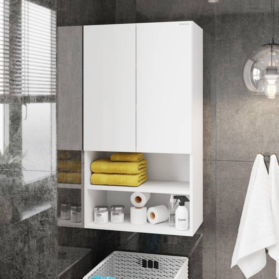 Компактные габариты позволяют грамотно организовать небольшой санузел: подвесной шкаф можно разместить над стиральной машиной. Открытые полки снизу и пространство за распашными дверцами с доводчиками помогут разместить все необходимые вещи.