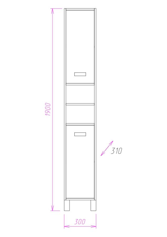 Посередине пенала - 2 открытые полки, сверху и снизу за распашными дверцами с врезными хромированными ручками и механизмом плавного закрывания скрывается просторное внутреннее пространство, разделенное горизонтальными полочками.