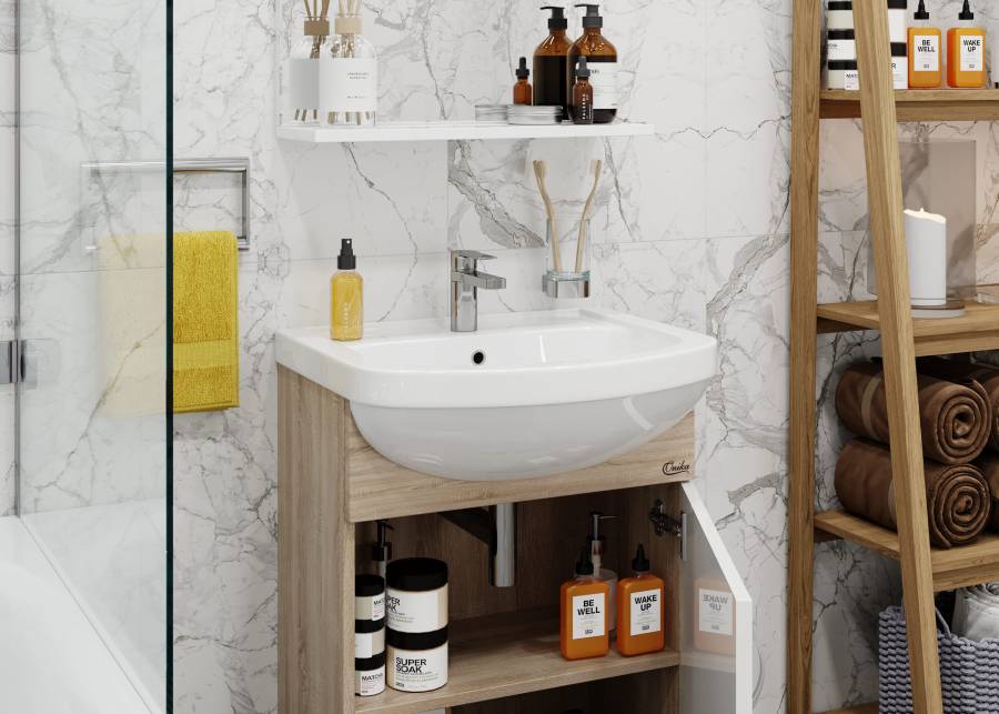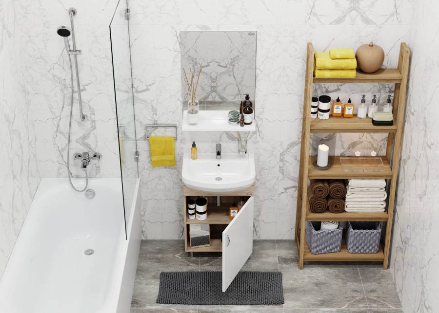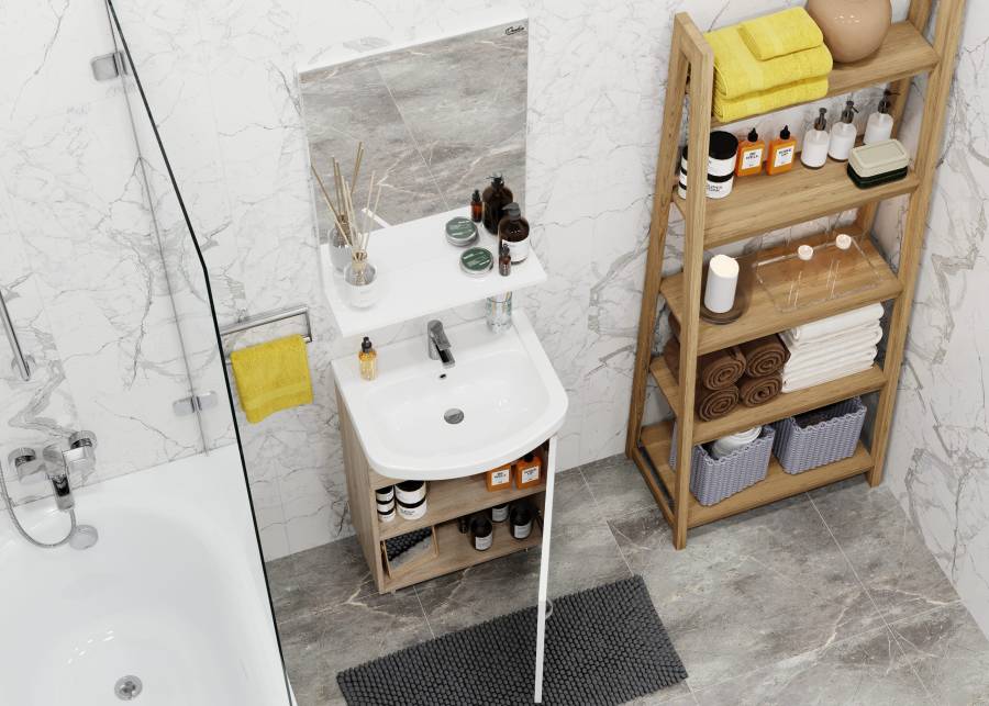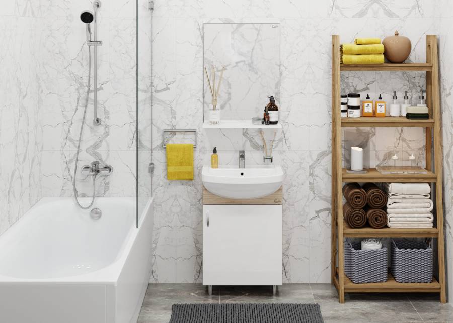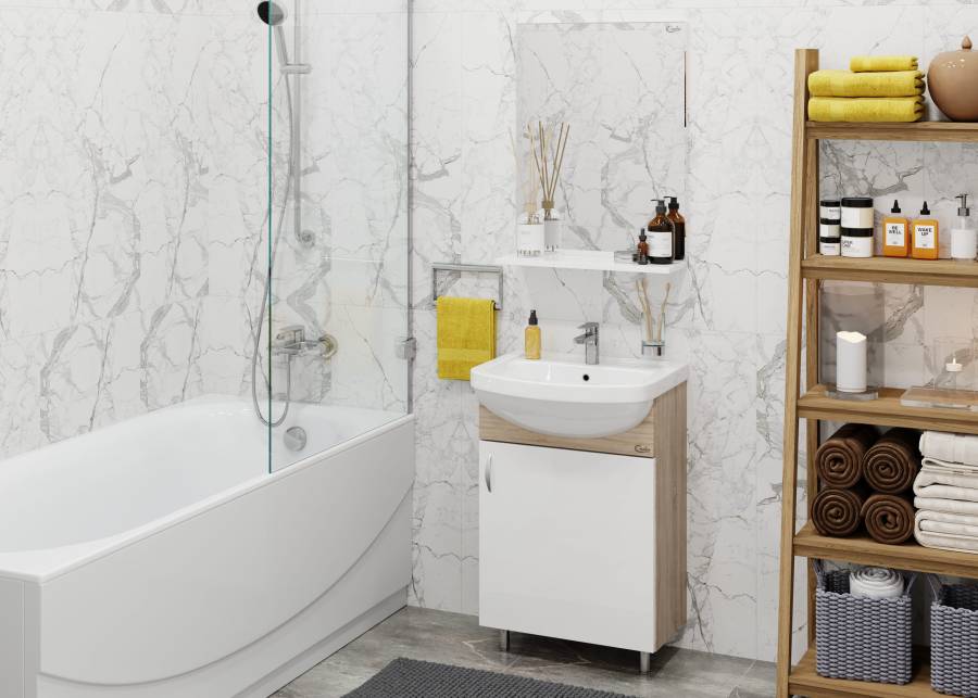 Компактные габариты позволяют грамотно организовать небольшой санузел, а простой белый глянцевый фасад и корпус цвета дуба с роскошной текстурой гармонично впишется в интерьер любой ванной комнаты.