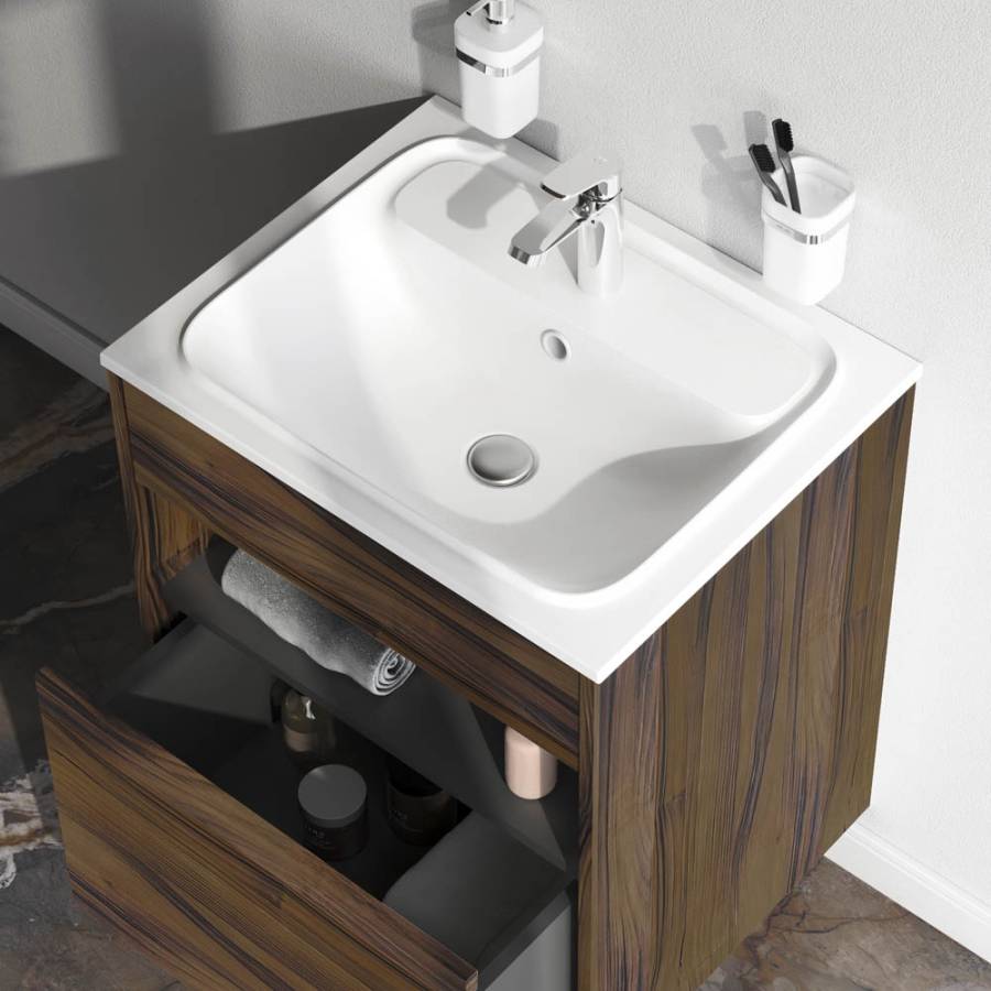Удобный выдвижной ящик и вместительная открытая ниша позволяют хранить все необходимые средства под рукой. Невероятно мягкое открытие и закрытие благодаря направляющим скрытого монтажа с системой soft close._x000D_