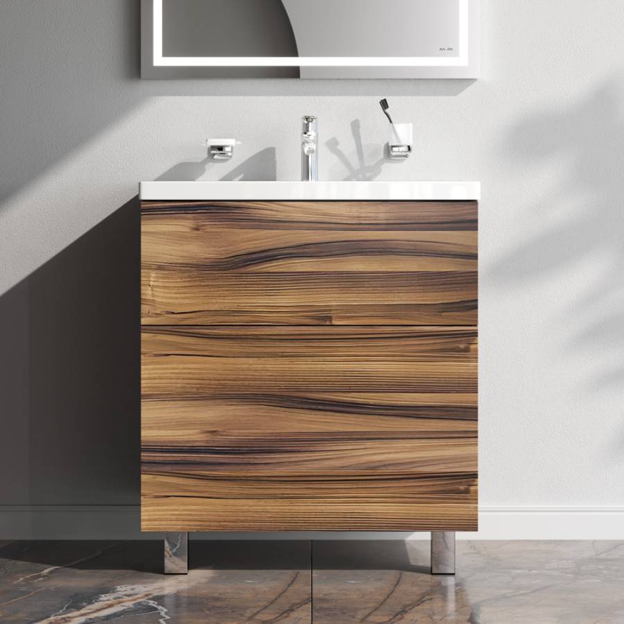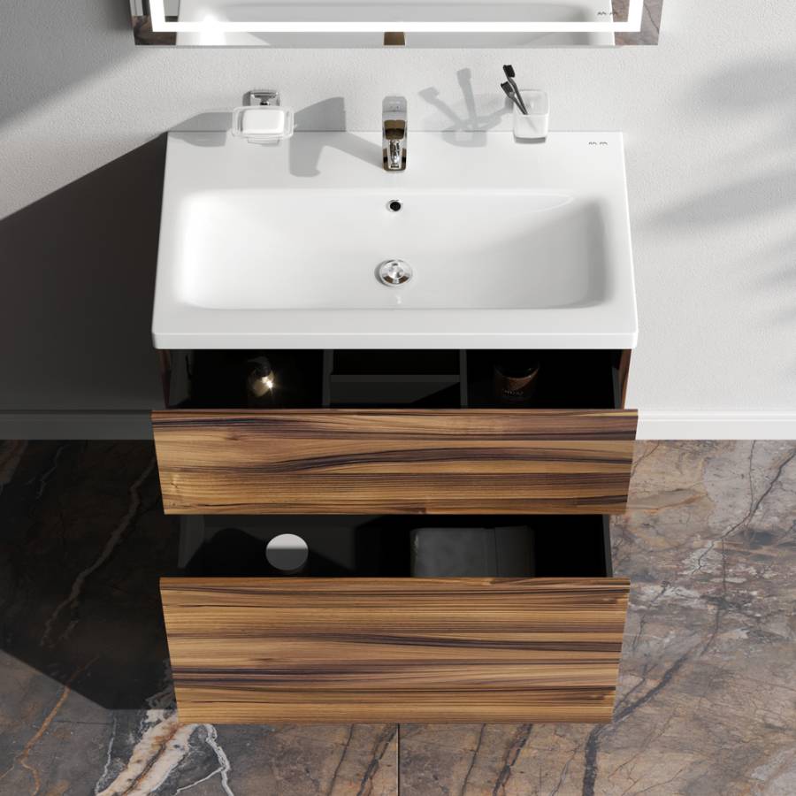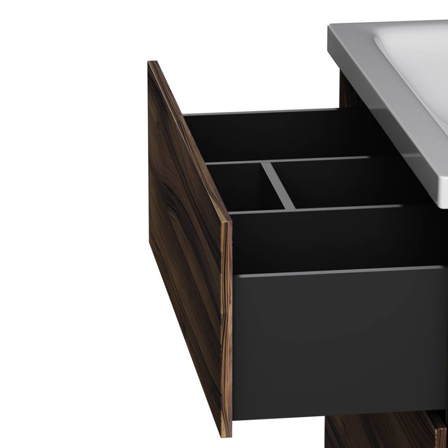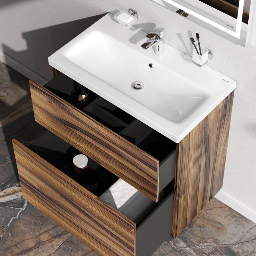 Представляем расширение цветовой палитры коллекции Gem в цвете “орех”. Напольная база под раковину изготовлена из влагостойкого ЛДСП. Внутреннее пространство двух вместительных ящиков представлено в цвете антрацит с антискользящим эффектом. _x000D_
