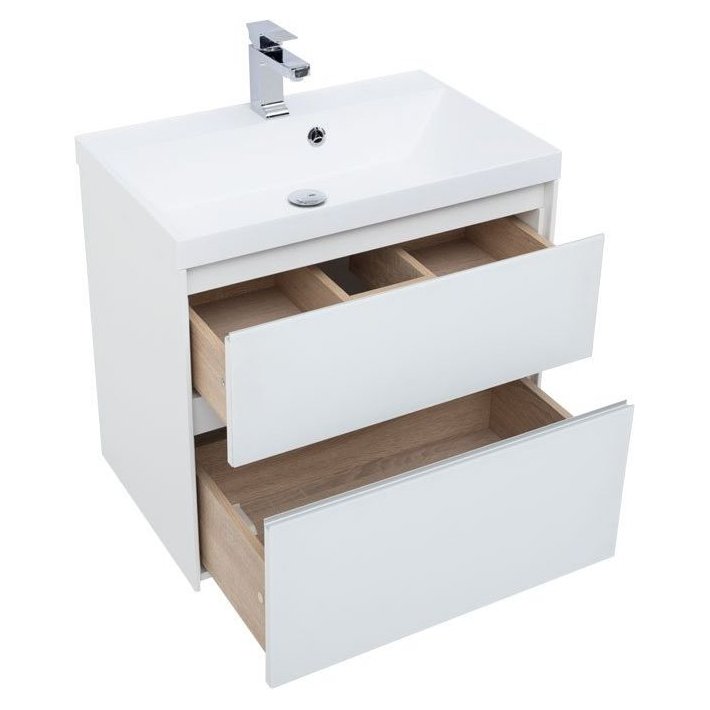 Производители позаботились о деталях. Ящики лишены выступающих деталей, ручки интегрированы в фасад. Тумбу можно из подвесного элемента преобразовать в напольный, просто докупив универсальные ножки. Раковина из литьевого мрамора «Орлеан» относится к числу накладных моделей и внешне выглядит как единое целое с тумбой. Ящики тумб оснащены направляющими Hettich Quadro c плавным закрыванием, более известным нам как доводчик.