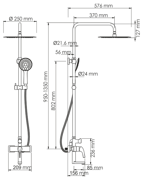 Душевая насадка 250 мм, 90 форсунок, нержавеющая сталь, Стойка для душа, 24 мм регулируемая по высоте, Лейка 3-функциональная с системой защиты от известковых отложений, Шланг металлический 1500 мм, подключение к лейке, Керамический картридж 35мм, Sedal (Испания), Встроенный пластиковый аэратор Neoperl HONEYCOMB (Германия) с регулируемым углом наклона струи, Керамический поворотный переключатель, Набор для монтажа |