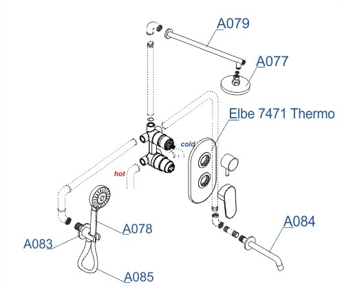 Смеситель для ванны и душа Elbe 7471, Подключение шланга A083, Шланг для душа 1500 мм А085, Верхняя душевая насадка A077 , Настенный верхний излив для душа A079 , Лейка 3-функциональная A078, Настенный излив для ванны A084 |