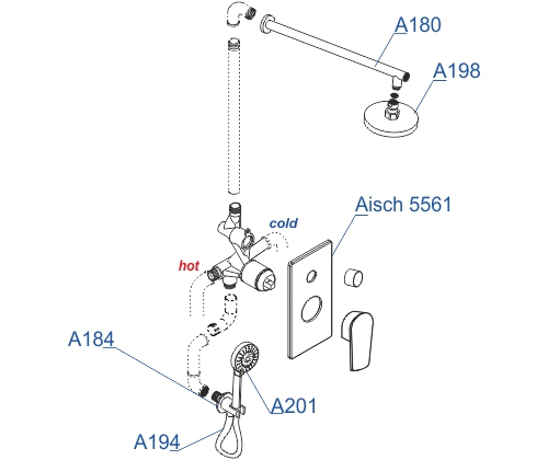 Смеситель для ванны и душа Aisch 5561, Подключение шланга A184, Шланг для душа 1500 мм A194, Верхняя душевая насадка A198, Настенный верхний излив для душа A180, Лейка 3-функциональная A201 |