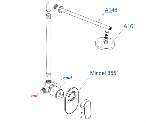 Смеситель для душа Mindel 8551, Верхняя душевая насадка A161, Настенный верхний излив для душа A146 |