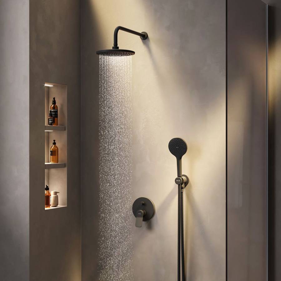 Верхний душ, Держатель для душа, Душевая лейка, Душевой шланг, Кронштейн для верхнего душа, Скрытая монтажная часть, Смеситель, Шланговое подключение |