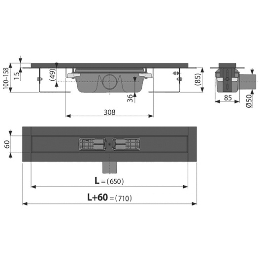 Водоотводящий желоб с сифоном; Монтажный комплект: шуруп Ø6×50 – 2 шт., дюбель Ø10 – 2 шт.; Самоклеящиеся гидроизоляционные ленты; Защитная пленка для воротника; Защитная пленка на вход в сифон; Монтажная крышка желоба - полистирол. |
