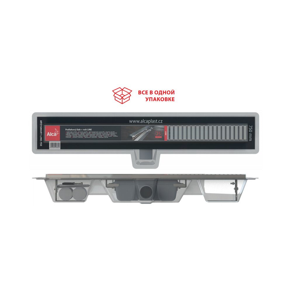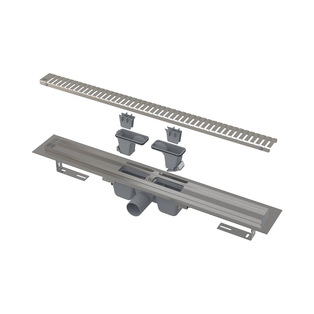 Желоб смонтированный с сифоном и комбинированным гидрозатвором; Монтажный комплект: шуруп Ø6×50 – 2 шт., дюбель Ø10 – 2 шт.; Самоклеящиеся гидроизоляционные ленты; Защитная пленка для воротника; Защитная пленка на вход в сифон; Монтажная крышка желоба - полистирол; Решетка LINE-M. |