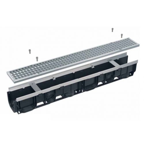 Оцинкованная перфорированная решетка – фиксация в корпусе канала с помощью четырех болтов из нержавеющей стали, размер сливных ячеек 12×18 мм |