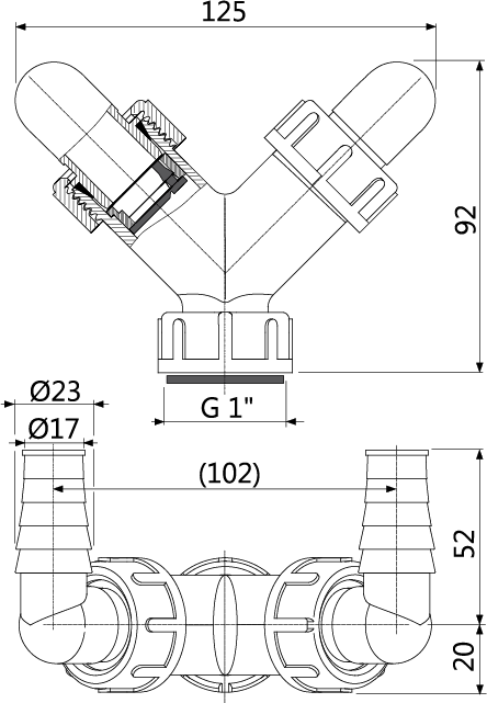 Корпус колена; Колено 17–23 мм 2 шт.; Прокладка; Пробки 2 шт.; Уплотнение-переходник 2 шт.; Обратный клапан 2 шт. |
