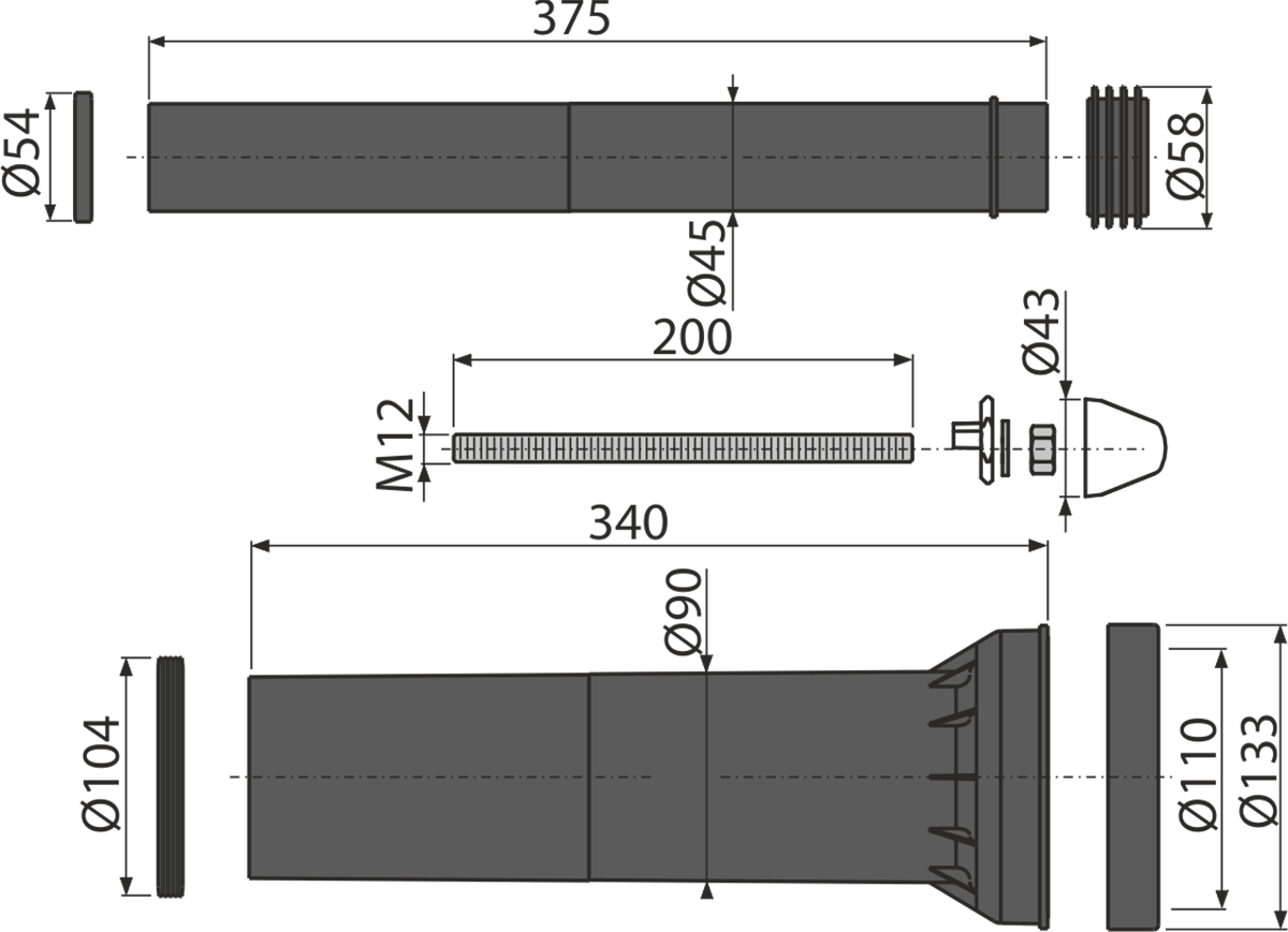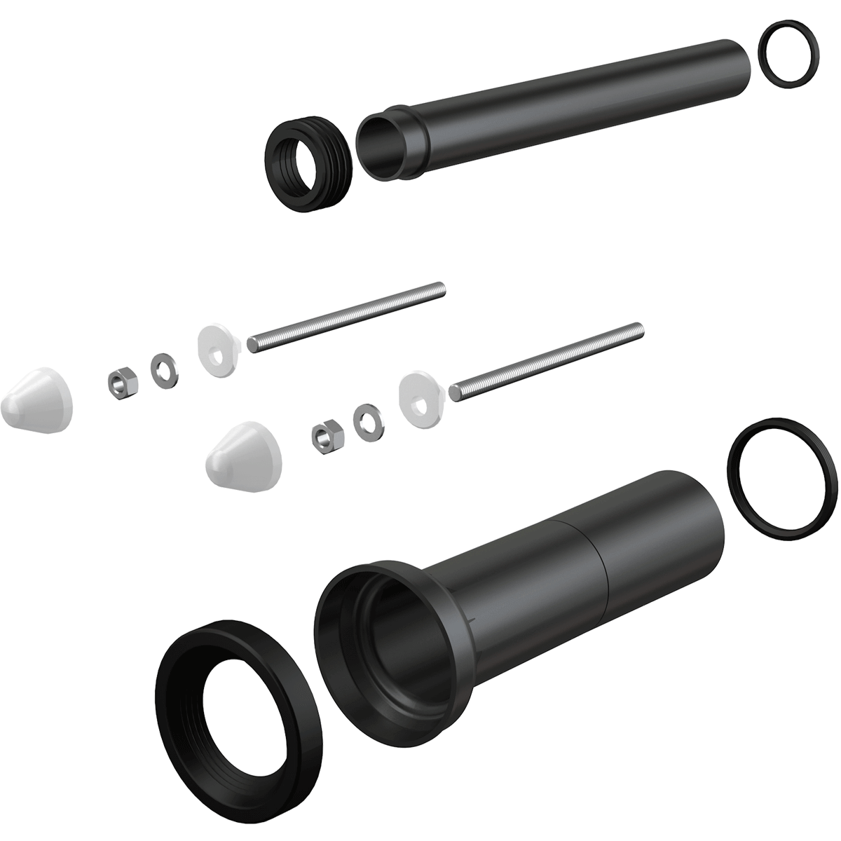 Патрубок сливной для подключения подвесного унитаза к стокам, полипропилен, Ø90 мм, с прокладками. Соединительный патрубок для подключения подвесного унитаза к бачку, полипропилен, Ø45 мм, с прокладками и манжетой. Монтажный комплект для крепления унитаза: шпилька М12 – 2 шт., шайба – 4 шт., колпачок – 2 шт., гайка – 2 шт., гофрированный рукав – 2 шт. |