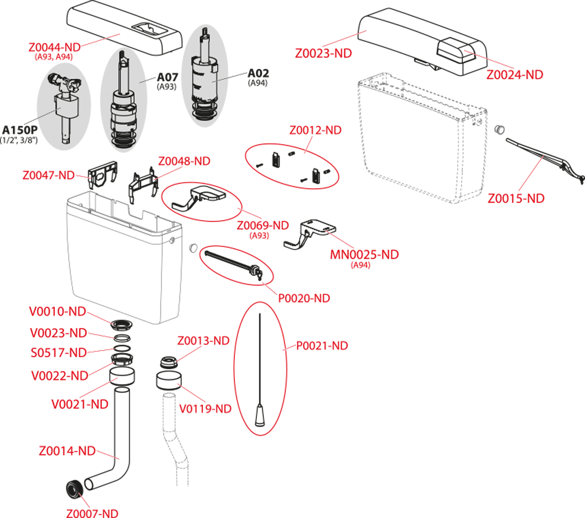Бачок. Впускной механизм (3/8″) и выпускной механизм. Колено Ø50/40 мм для низкорасположенного бачка. Комплект для смыва, предназначенный для высокорасположенного бачка (шнур, рукоятка, рычаг). Комплект для смыва, предназначенный для низкорасположенного бачка (кнопка малая и большая). Монтажный комплект: винт Ø5×40 – 2 шт., дюбель Ø8 – 2 шт. |