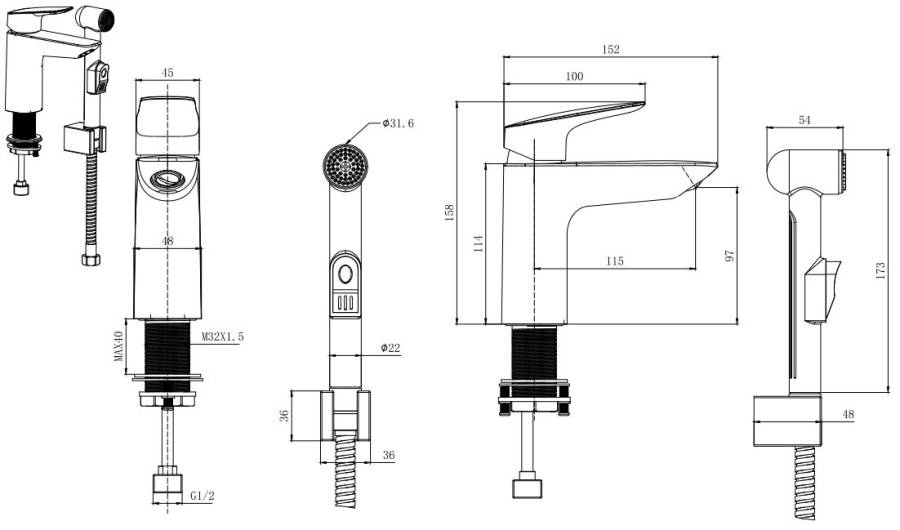 1. Смеситель 2. Гибкая подводка 50см 3. Шланг для лейки 150 см 4. Гигиеническая лейка, размер лейки 173*54 мм, оснащена нажимным механизмом для остановки потока воды 5. Настенный держатель для гигиенической лейки 6. Монтажный комплект |