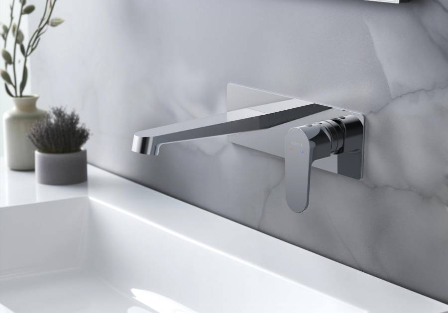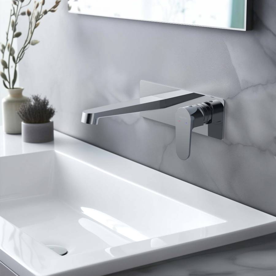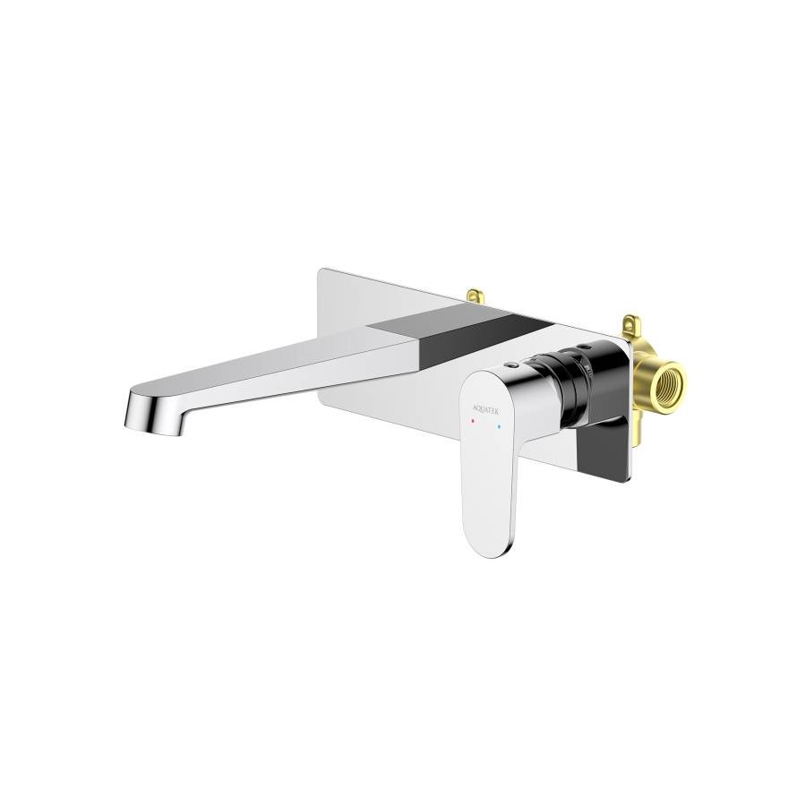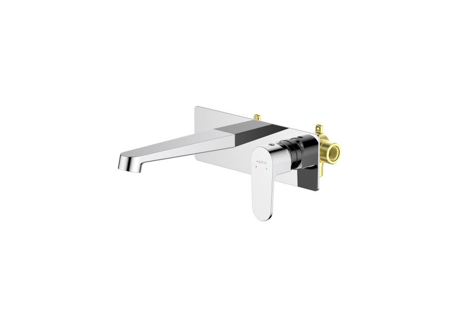 1. Смеситель (внешняя и скрытая часть) 2. Декоративная накладка на стену из нержавеющей стали 3 мм 3. Излив смесителя |
