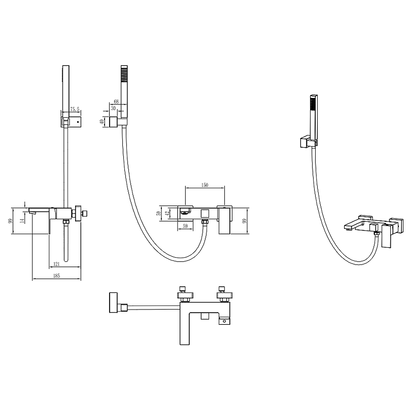 Смеситель для ванны. Ручной душ. Душевой шланг. Держатель ручного душа. Комплект креплений. |