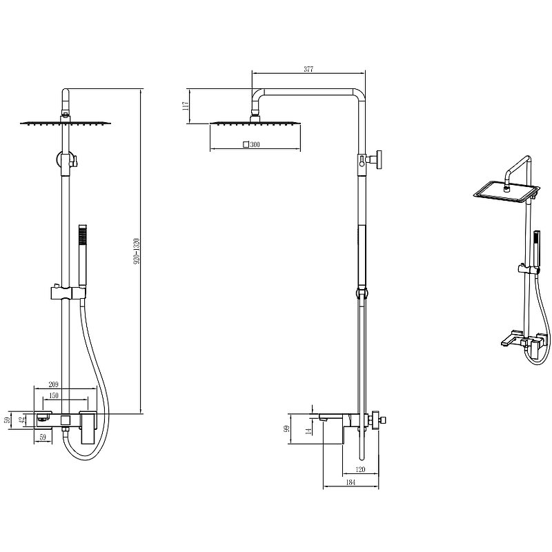 Смеситель с изливом. Душевая штанга. Верхний душ. Ручная лейка. Душевой шланг. Комплект креплений. |
