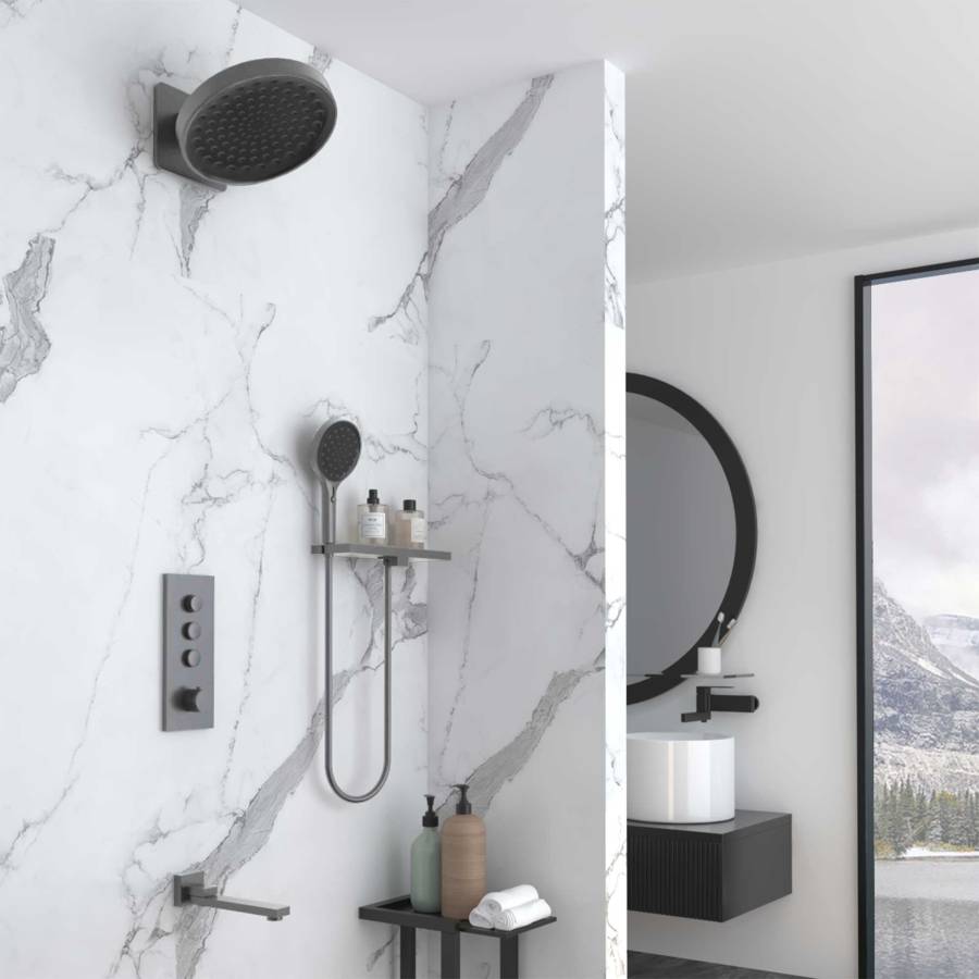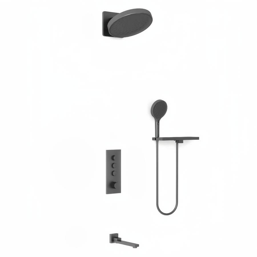 Верхний душ Inspire VSHD-3I3CGM, вороненая сталь Полка с держателем для душа VSRC-41GM, вороненая сталь Ручной душ с шлангом Inspire VSHN-3I2HGM, вороненая сталь Встраиваемый смеситель для душа VSCV-433TGM трехфункциональный, термостатический, вороненая сталь Излив VSWS-41GM, вороненая сталь |