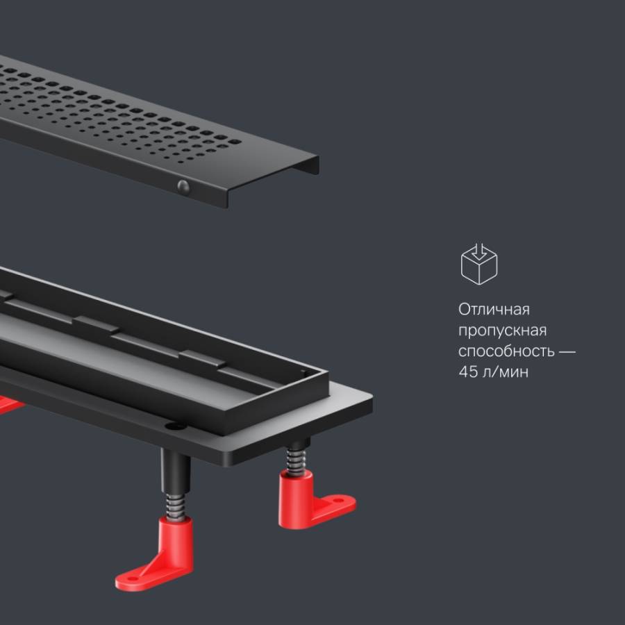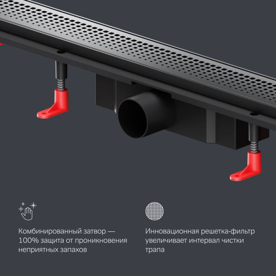 Продукт обладает низкой высотой монтажа и возможностью регулировки что предполагает экономию бюджета при заливке пола. Трап имеет инновационную конструкцию решетки с фильтром что значительно увеличивает межсервисный интервал._x000D_
