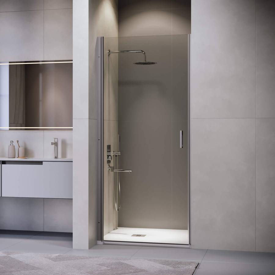 Душевая дверь изготовлена из стекла толщиной 6 мм, обеспечивающего превосходную прочность и долговечность. Прозрачный цвет стекла создает современный и открытый вид, а серый цвет профиля добавляет нотку элегантности. Общая высота двери составляет 1950 мм, что делает ее подходящей для большинства стандартных душевых кабин.