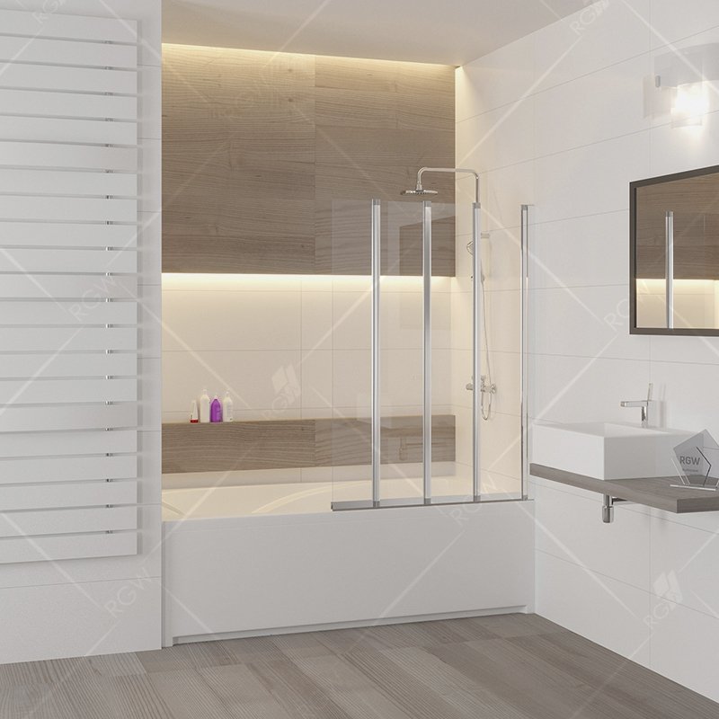 Высота стеклянной шторки составляет 1500 мм, что позволяет использовать ее в большинстве стандартных ванных комнат. Конструкция створки шторки складная, что обеспечивает легкость в использовании и удобство при уборке ванной комнаты.