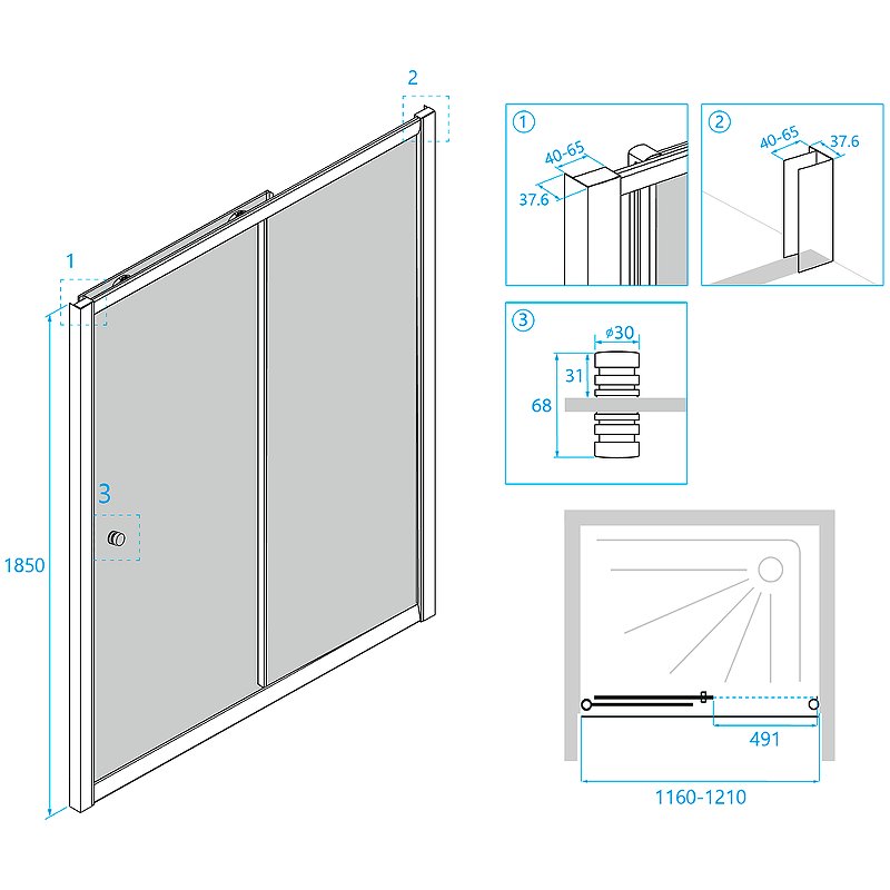 Общая высота двери составляет 1850 мм, что позволяет использовать ее в стандартных ванных комнатах. Кроме того, для установки двери предусмотрен дополнительный профиль. Это позволяет регулировать ее размеры и подгонять под индивидуальные нужды.