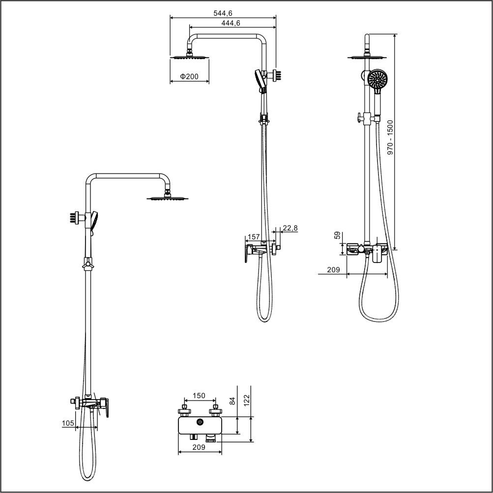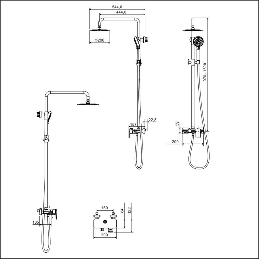 - верхний душ Ø20 см, отдаленность от стены: 42,4 см;