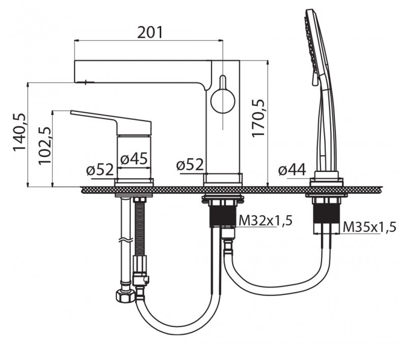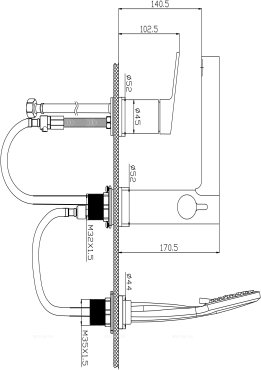 Смеситель. Излив для ванны с девиатором. Ручной выдвижной душ. Крепления. |