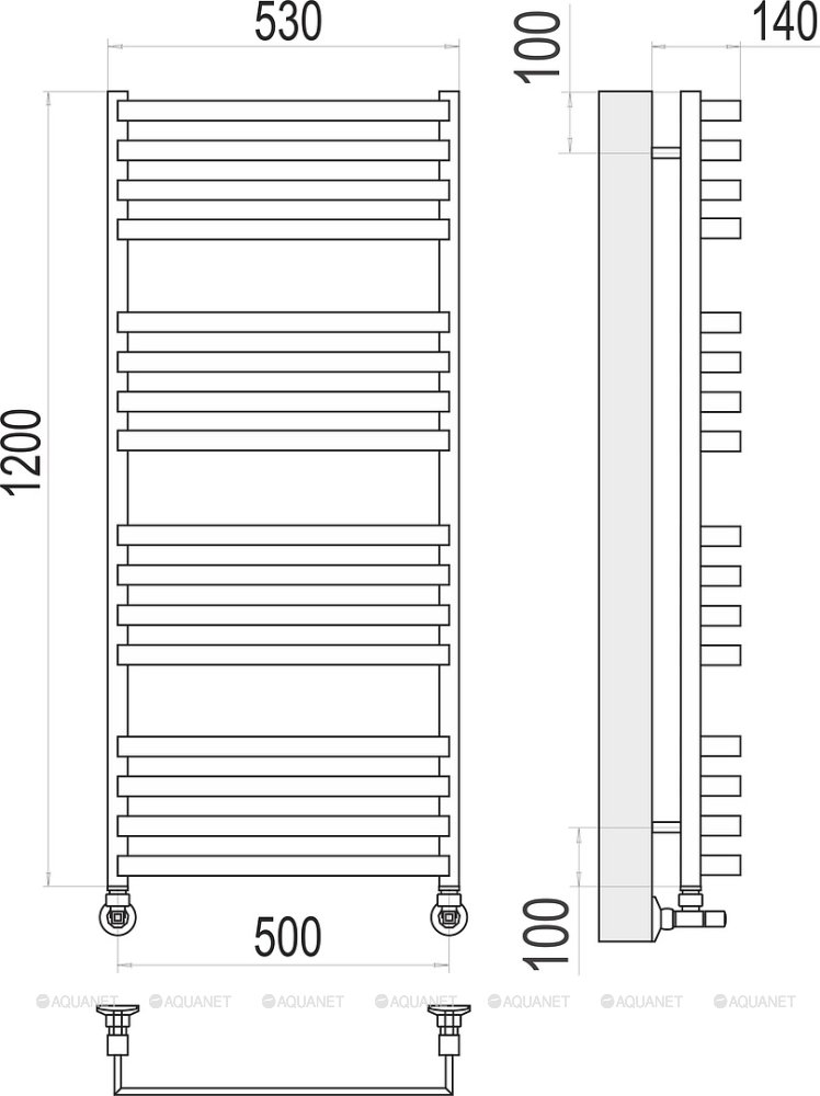 Полотенцесушитель - 1 шт.,Комплект креплений - 1 шт.,Комплект декоративных заглушек - 1 шт.,Кран Маевского - 1 шт.,Эксцентрик - 2 шт.,Отражатель - 2 шт.,Вентиль - 2 шт., |