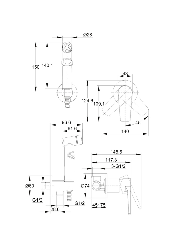 Рукоятка, лейка гигиенического душа, подключение для шланга, шланг в металлической оплетке 1/2" 120см, паспорт изделия с гарантийным талоном, инструкция по эксплуатации |